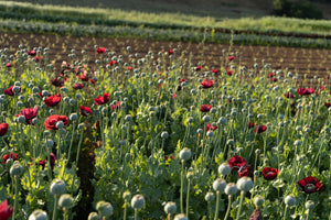 A breadseed poppy (Papaver somniferum) strain that produces medium sized vibrant red flowers that reach up to three to four inches in diameter. Seed pods produce substantial amounts of black edible seeds. A great dual purpose culinary and ornamental variety.